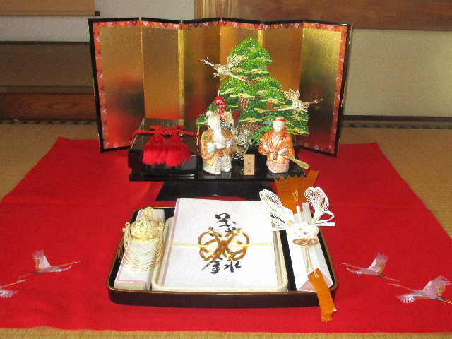 共に白髪の生えるまで仲良く、毎年お正月飾って頂きたいと思い高砂のお人形をセットいたしました。高砂のお人形(¥12,000)を省く事も出来ます。